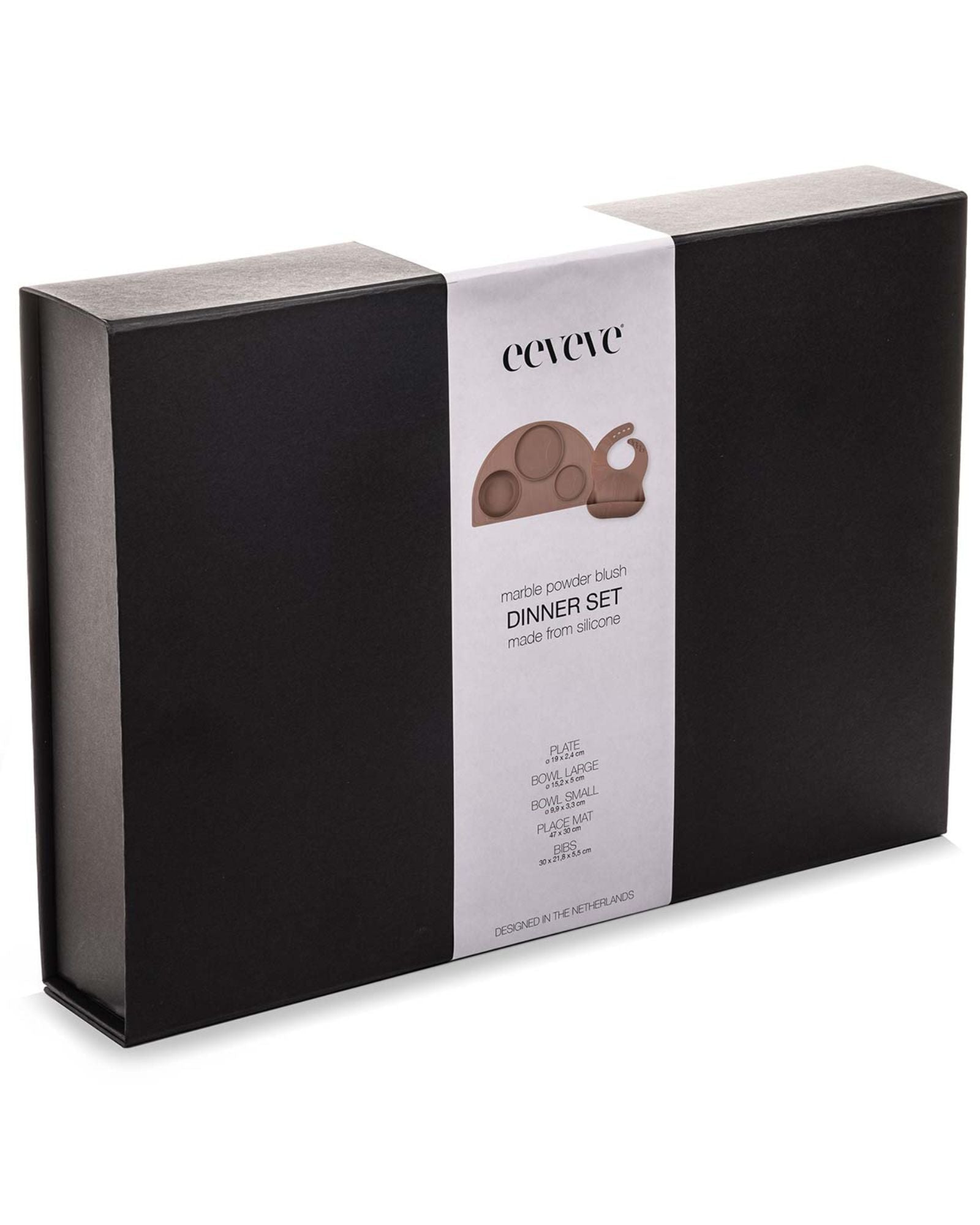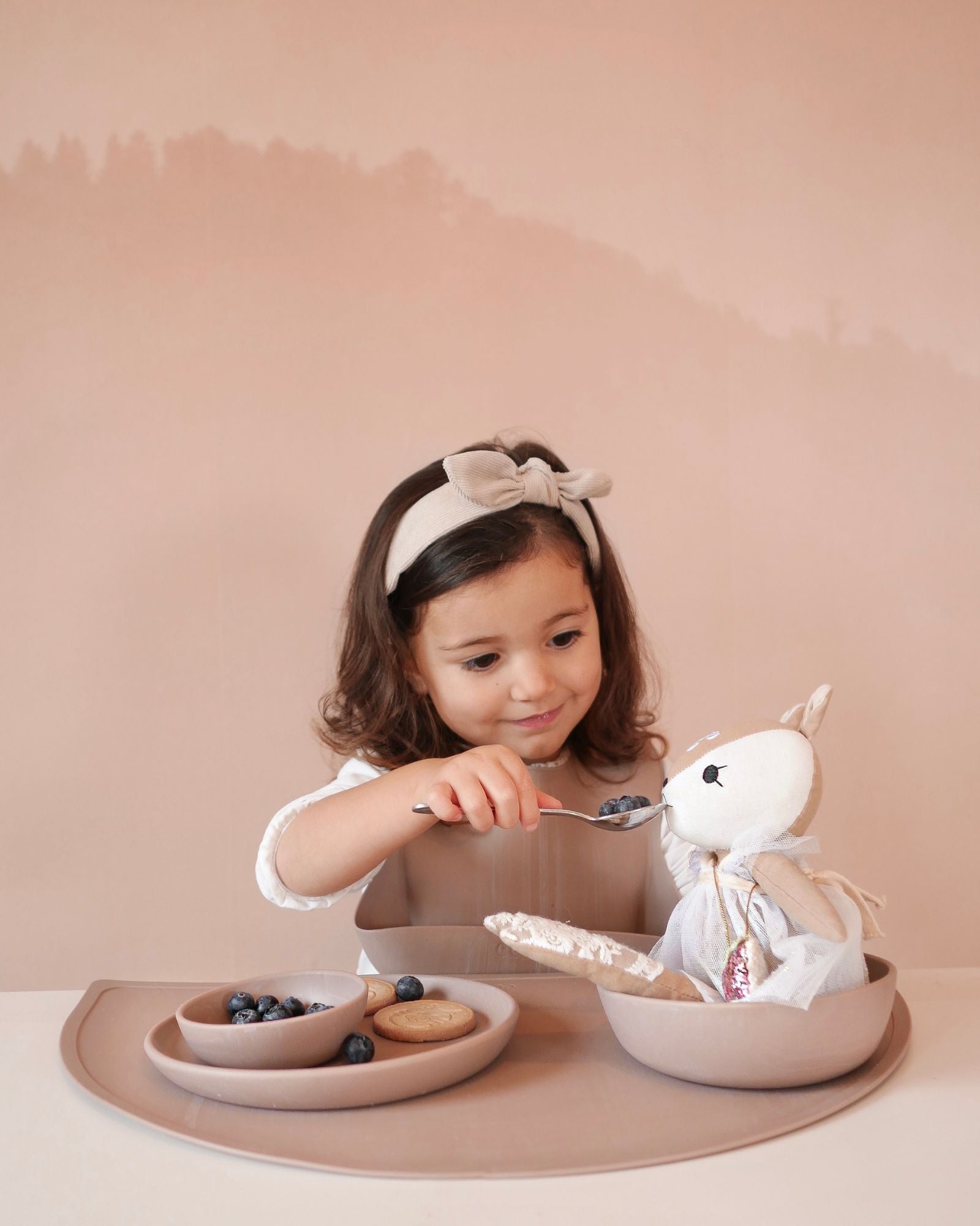 Gift Set Content (5 silicone items): Placemat, plate, bib, large and small-sized bowl. Child-friendly but with an adult look for a uniform table setting.