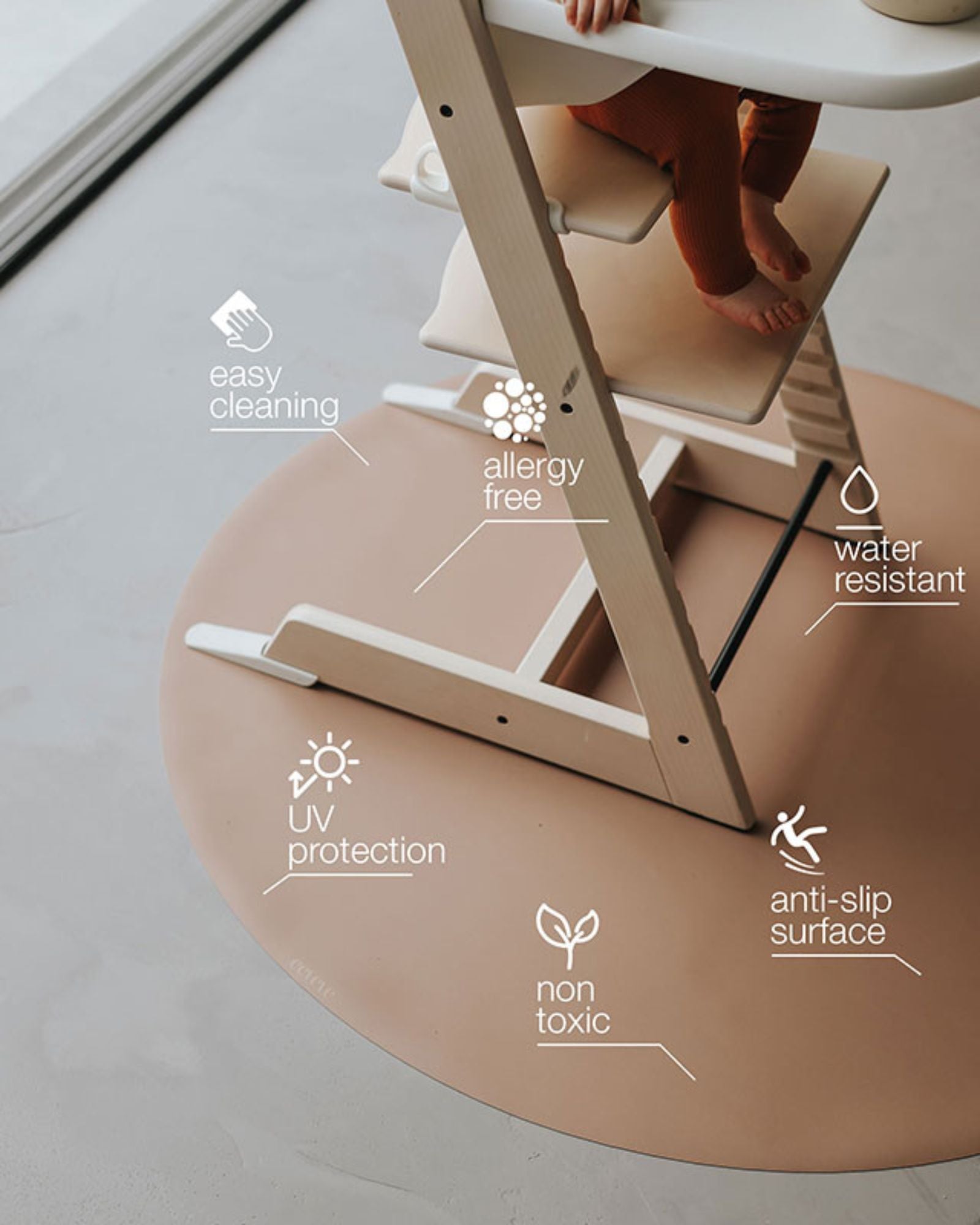 Whether it’s your baby’s first spoonful or a fun craft session, a high-quality floor protector under the high chair is a true must-have. Our round splat mat shields your floor while adding style and function in one. Made from waterproof vinyl, it’s easy to clean and comes in subtle colours and timeless designs, perfect for any interior. The ideal balance of practicality and style.
