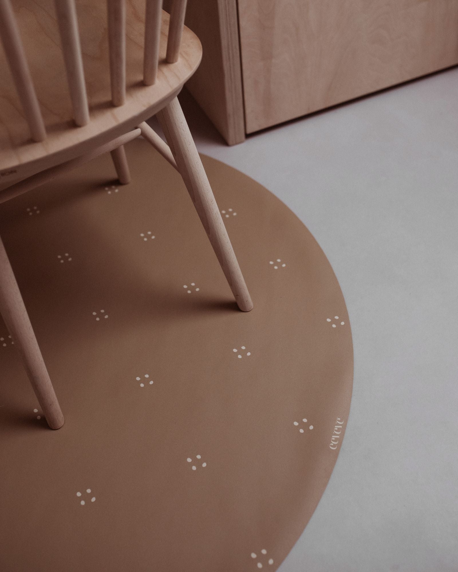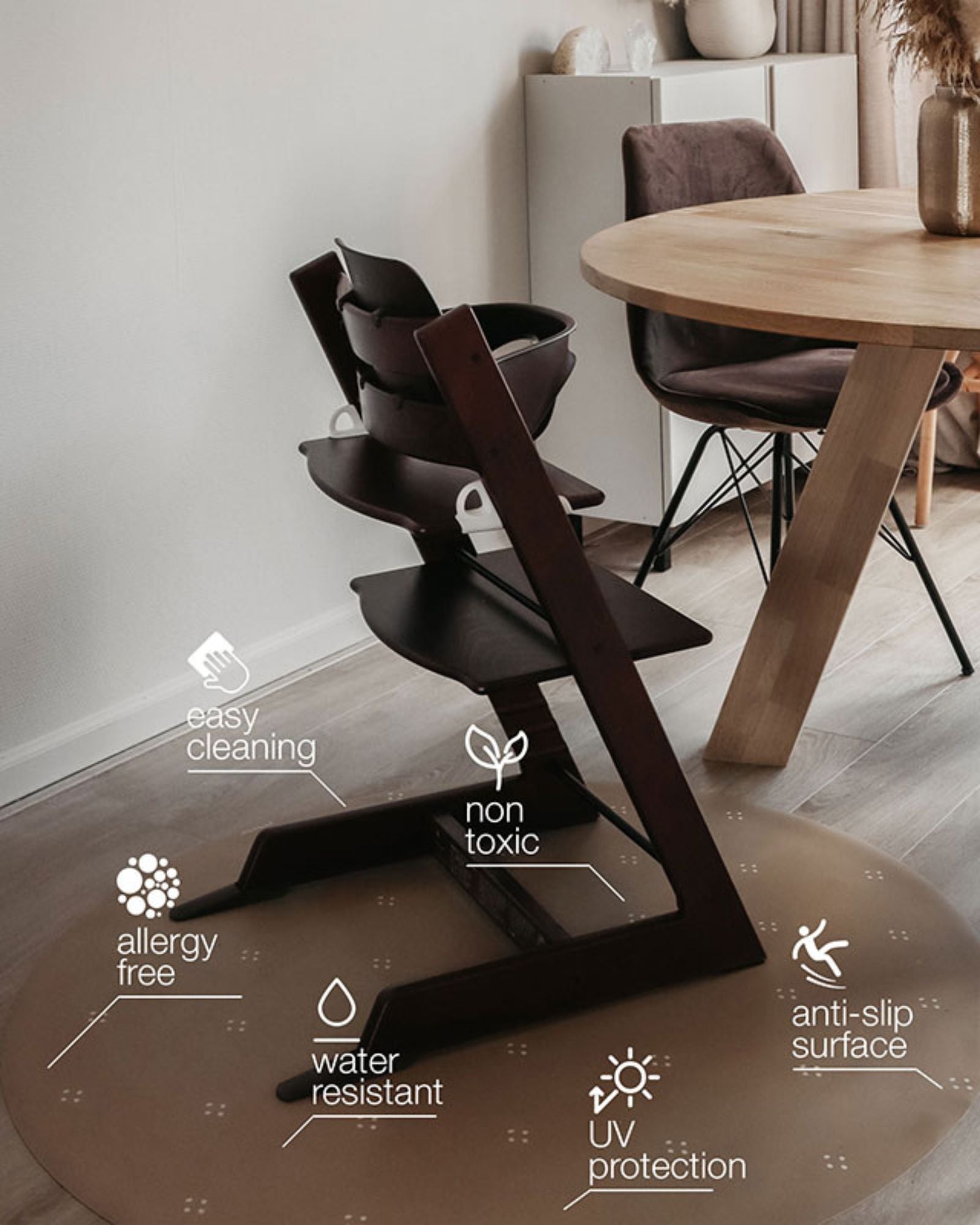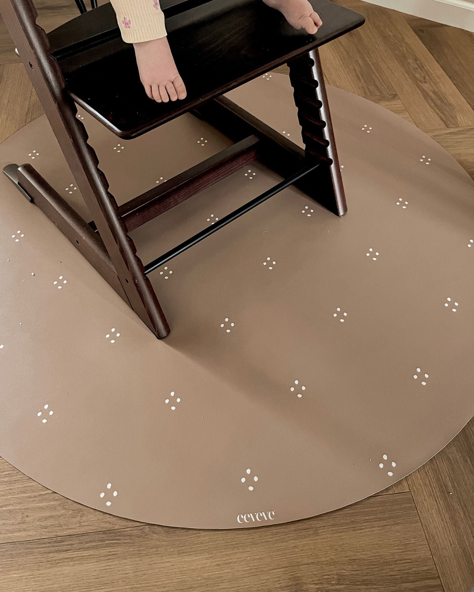 Whether it’s your baby’s first spoonful or a fun craft session, a high-quality floor protector under the high chair is a true must-have. Our round splat mat shields your floor while adding style and function in one. Made from waterproof vinyl, it’s easy to clean and comes in subtle colours and timeless designs, perfect for any interior. The ideal balance of practicality and style.